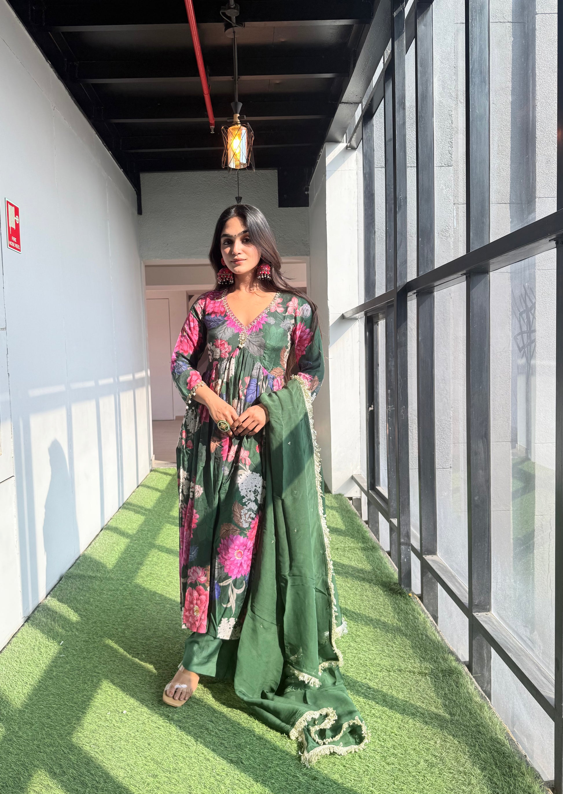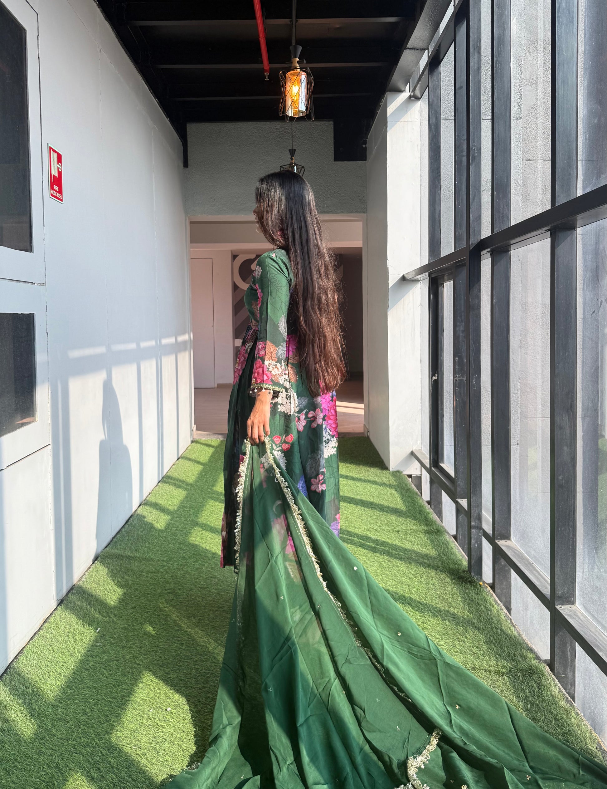 Featuring a green floral digitally printed and embroidered cotton silk kurta, this elegant ensemble is paired with a lightweight organza dupatta for a graceful festive look. The kurta is beautifully detailed with pearl embroidery around the neckline and sleeves, adding a touch of refined charm. The organza dupatta is adorned with delicate sequin embellishments and finished with gotta lace, enhancing its festive appeal.